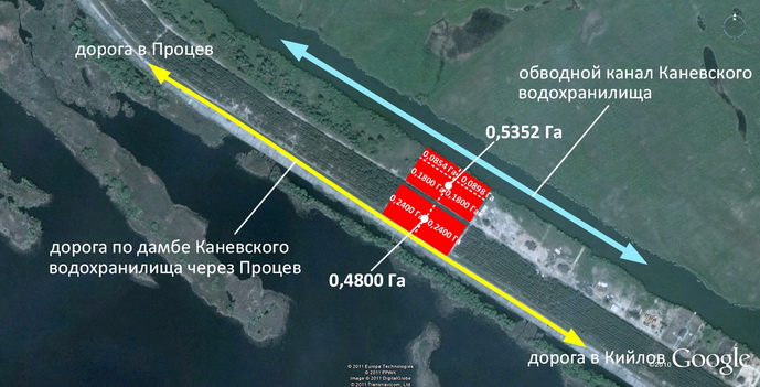 Рассматриваемые земельные участки расположены неподалеку от юго-восточной части с. Процев. Северная сторона участка на 0,54 Га примыкает к обводному каналу Каневского водохранилища, с южной стороны второго участка на 0,48 Га расстилается дамба Каневского водохранилища, по которой проходит хорошая асфальтированная дорога. Территория данных мест умиротворяет своими красивейшими панорамами лугов и массивами хвойных лесов.